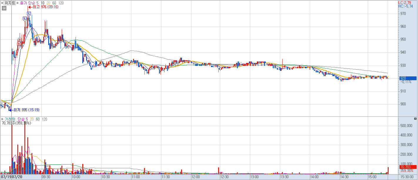 내용: 장초반 전고점 돌파하는 모습에 분할로 진입. 주가가 워낙 싸다보니 1주 이상 살 수 있었다. 이후 긴 윗꼬리가 달리면서 일봉상 60선에 근접해가는 모습에 분할 매도. 수익은 적었지만 나름 잘한 매매인 듯 보인다.