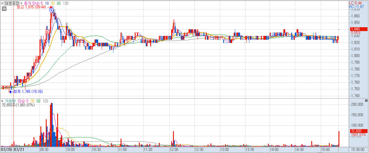 매수 사유: 장초반 큰 갭상 이후 대량의 거래량에 진입.