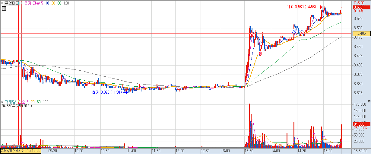 매수 사유: 현대공업이 급등하는 모습에 좀 늦은 것 같아 같이 뛰는 구영테크 진입.