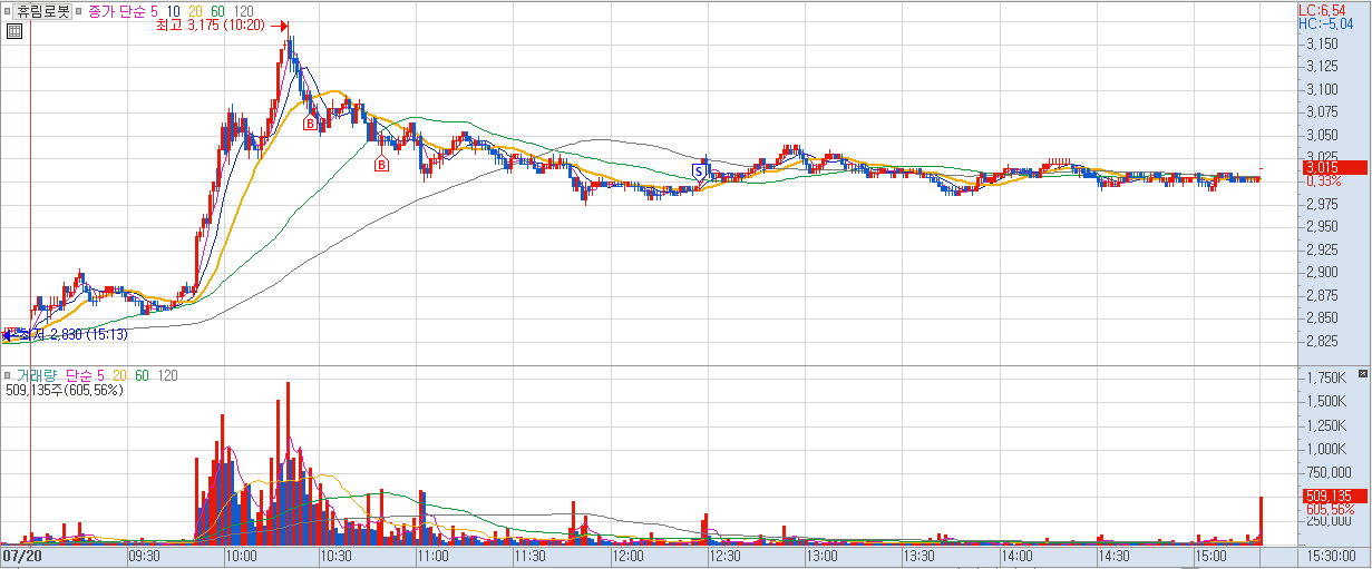 내용: 장초반 거래량이 터지는 모습에 보고 있다가 전일 고점에 진입. 20선에서 한번 더 물타기를 생각하고 있었는데 다른 종목을 사버리는 바람에 물타기는 실패. 하지만 횡보가 너무 길어지는 모습에 하방을 의심했고, 매수가 매도로 미리 걸어놓고 빠져나왔는데 이후 급등ㅠㅠ 운도 참 지지리도 없네 덴장