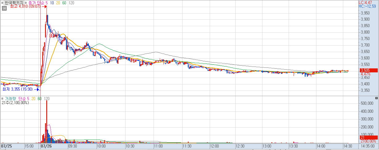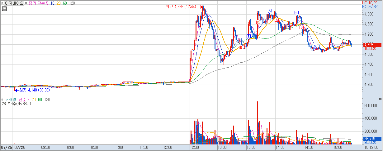 매수 사유: 장중에 갑자기 곡물 관련주가 급등하는 모습에 이지바이오가 대장주처럼 보여 진입.