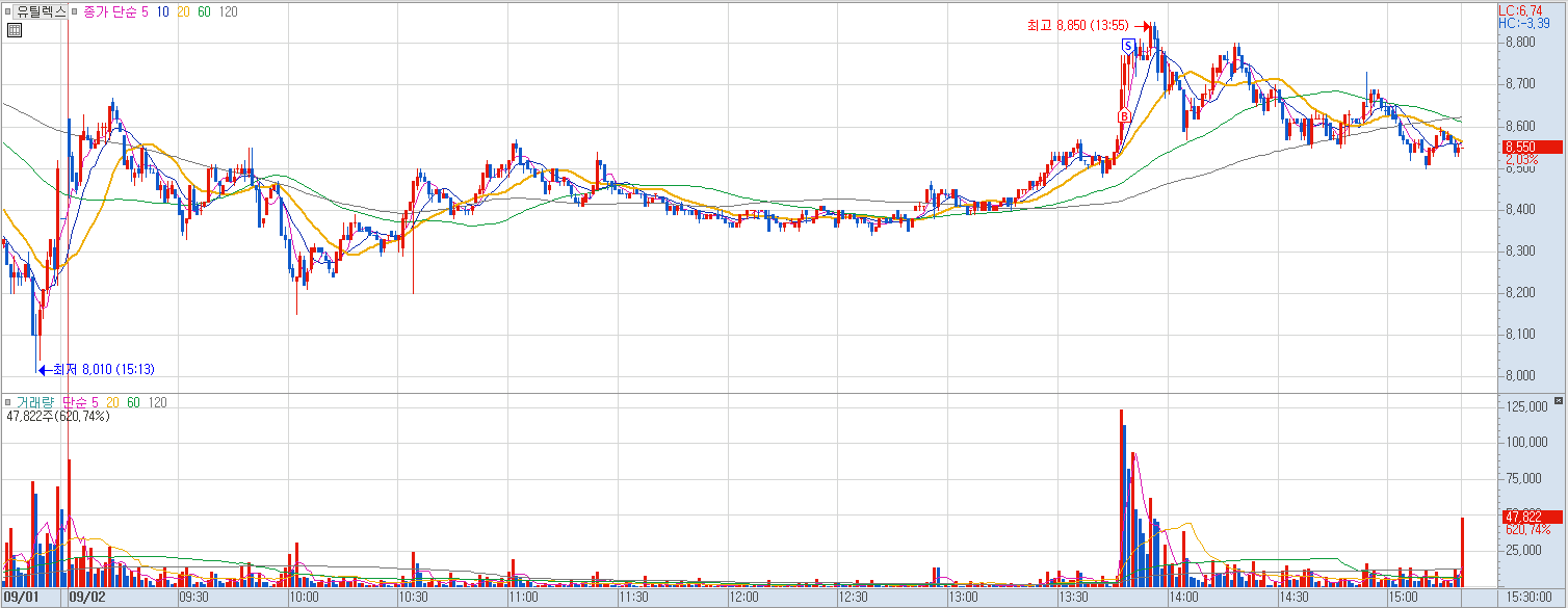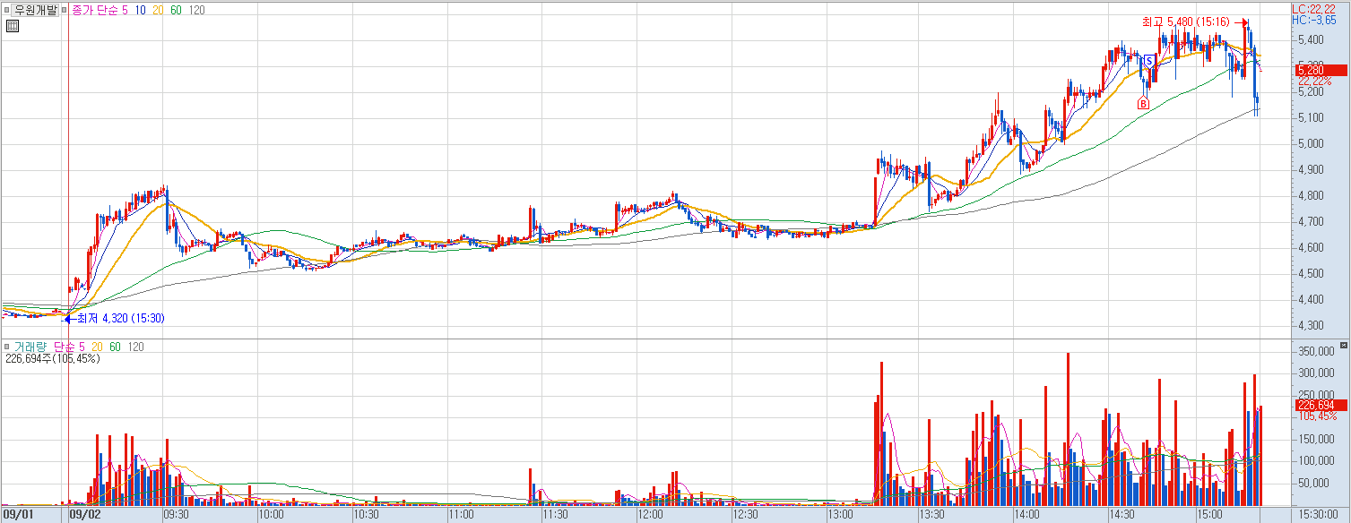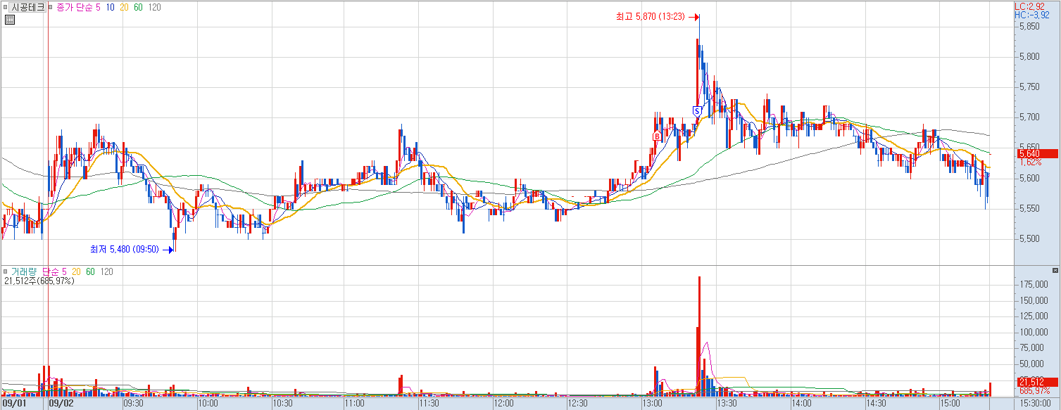 내용: 평소 같았으면 직전 고점인 5370원 라인까지 버텨봤을텐데 장막판에 짱돌을 던지는 녀석들이 많아서 그냥 짧게 먹고 나왔다.