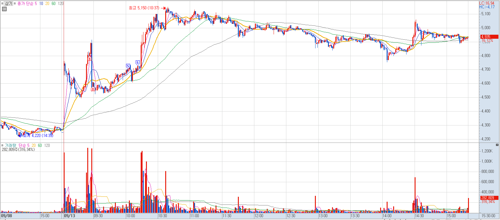 매수 사유: 당일 고점을 거래량과 함께 돌파하는 모습과 최근 포르쉐 관련주로 급등했던 이력에 진입.