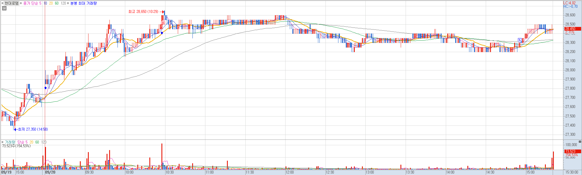 내용: 오늘 거의 하루종일 들고 있었던 종목인데 결과는 아쉬웠다. 지지 라인을 보였던 28,200원에 물타기를 할지 말지를 고민하며 물량을 넣다뺐다를 반복했는데 그냥 과감하게 물타기를 했어야 했는데 아쉽다. 그랬다면 적어도 본절은 했을텐데. 28,200원이 확실한 지지라인인지 판단되지 않아 좀 더 기다렸었는데 과감하게 했어야 했다. 그리고 확실히 무거운 종목은 단타로는 별로 재미가 없는것 같다. 움직임이 둔하다. 급락이 없어서 안전하긴 하지만 급등도 없다.