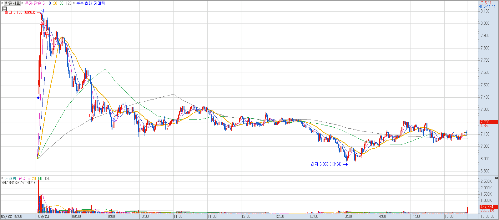 내용: 오늘 이 종목으로 크게 박살났다. 첫 진입도 머뭇거리다가 너무 뒤늦게 진입해서 짧게 먹고 나왔다가 다시 기어들어가서는 강하게 얻어맞고 결국 큰 손절로 마감했다. 저점을 찾다가 결국 지하실까지 기어들어간 꼴이 됐다. 매매했던 차트들 보면서 주말 내내 대책을 생각해봐야겠다.