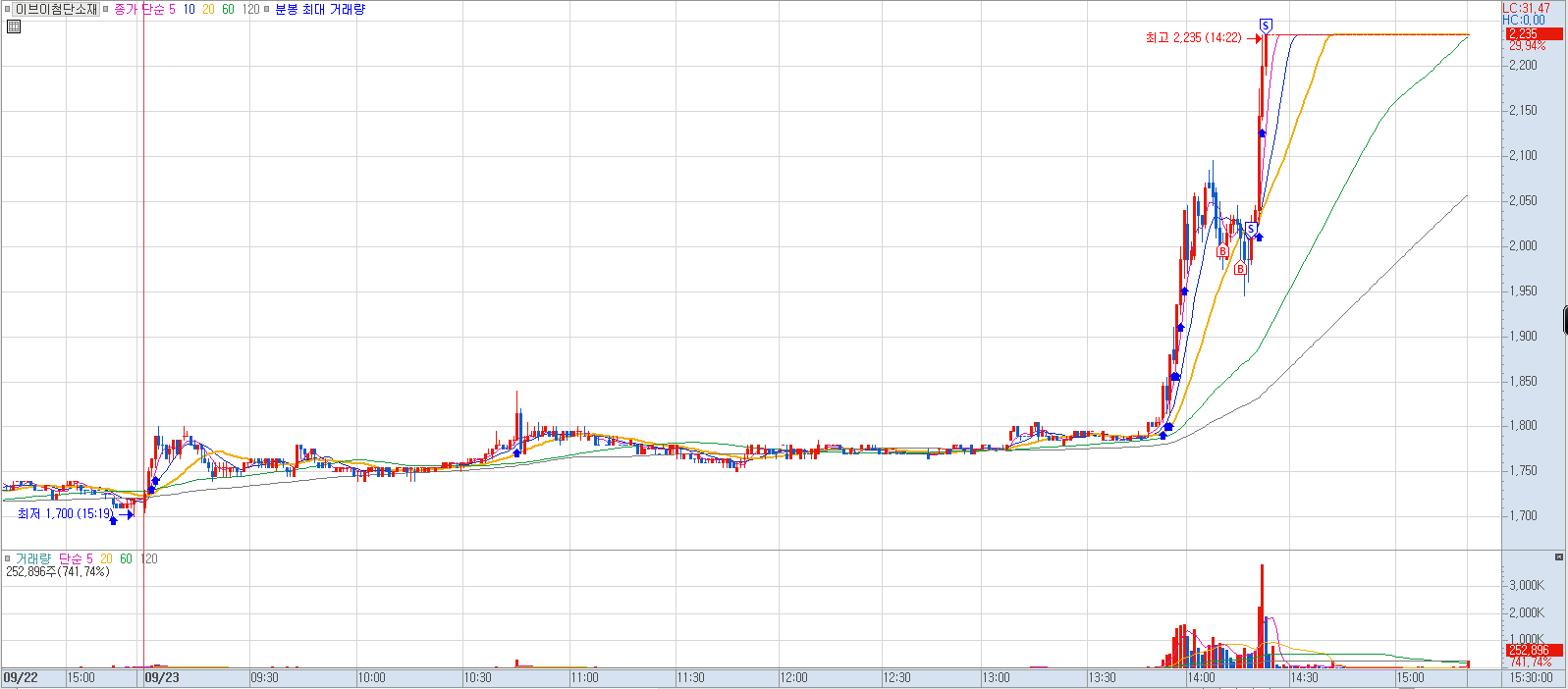 매수 사유: 거래량을 동반하며 당일 전고점에 돌파하는 모습에 진입