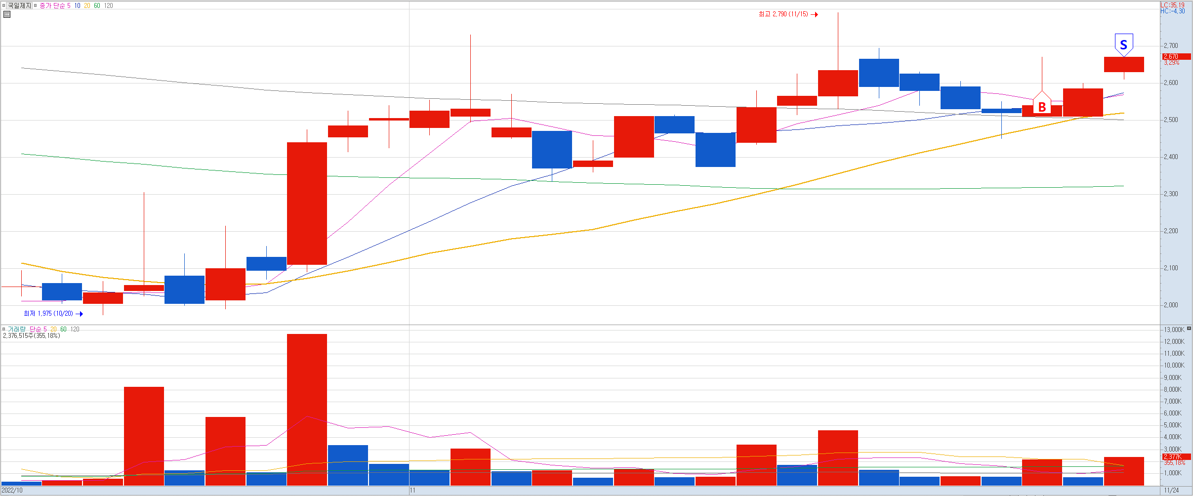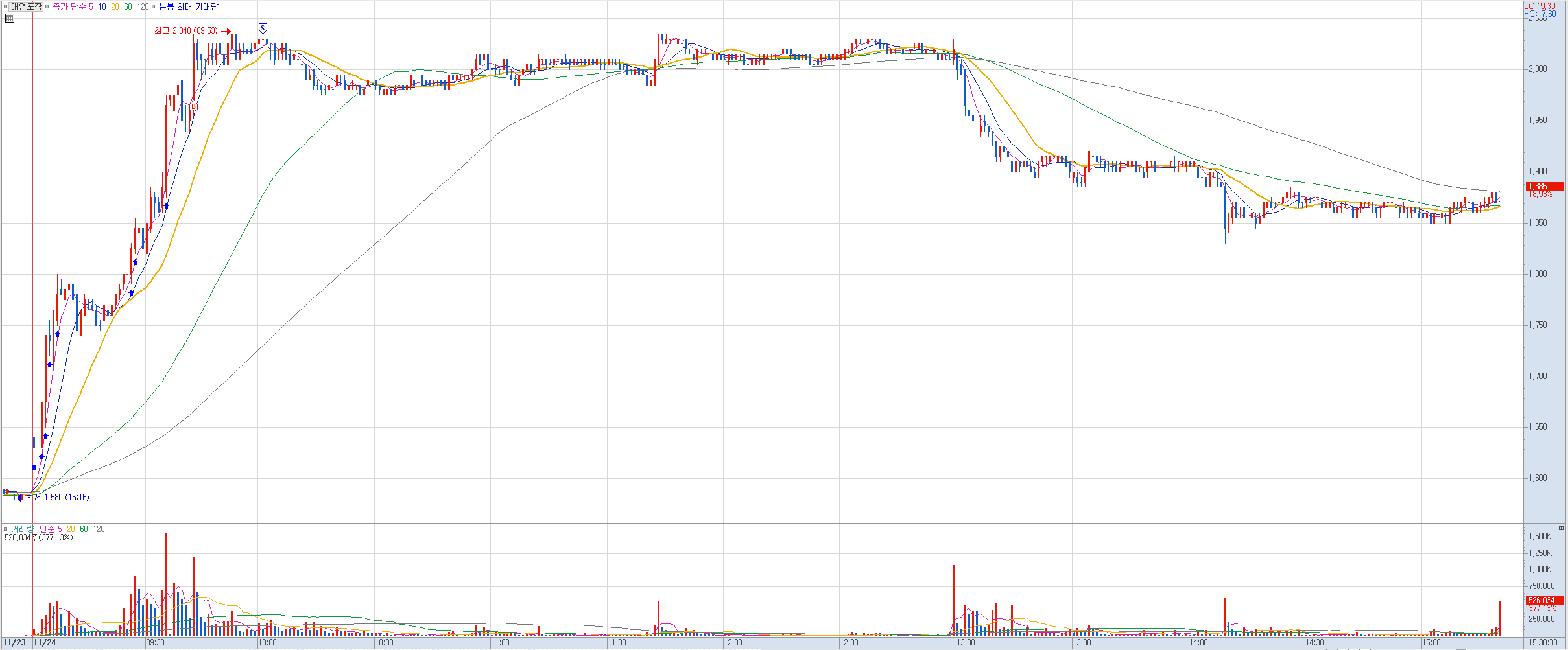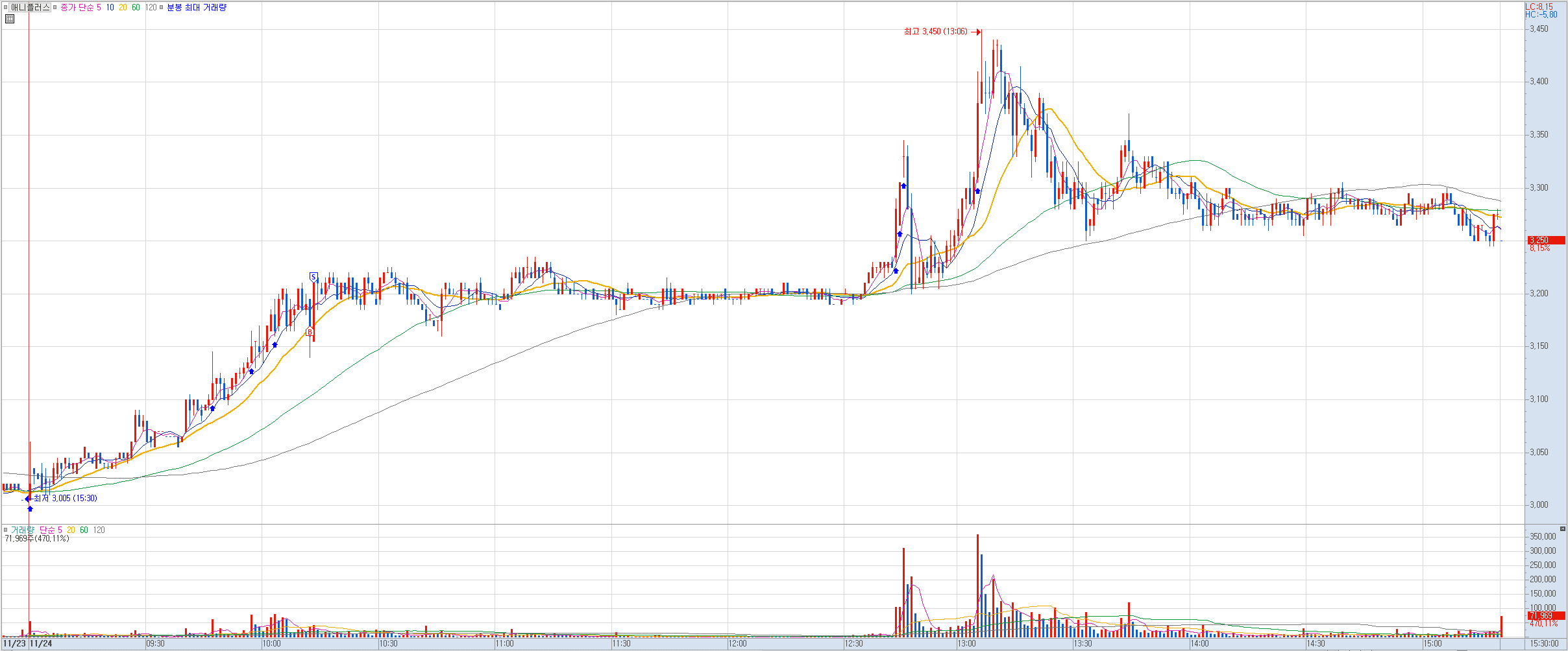 내용: 내 기준상 좀 뒤늦게 잡아들어갔다. 오늘 슈팅이 좀 나와줬으면 했는데 강하게 상승하지 못하는 모습에 그냥 오늘 약 수익으로 마감했다.