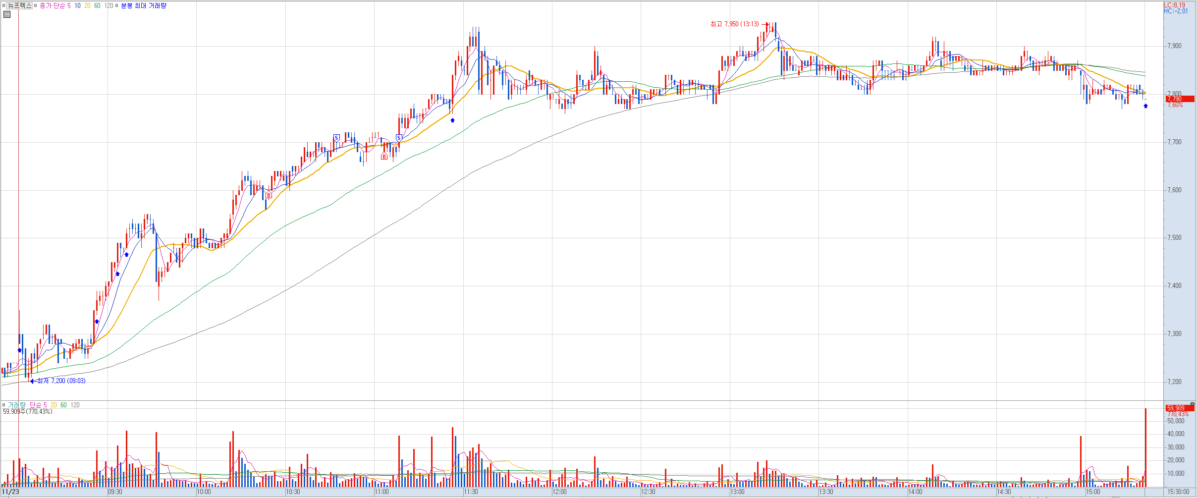 내용: 첫 매수부터 7.900원까지 상승을 예상하고 들어갔으나 잔파동을 견디지 못하고 그냥 약수익으로 마감ㅠㅠ