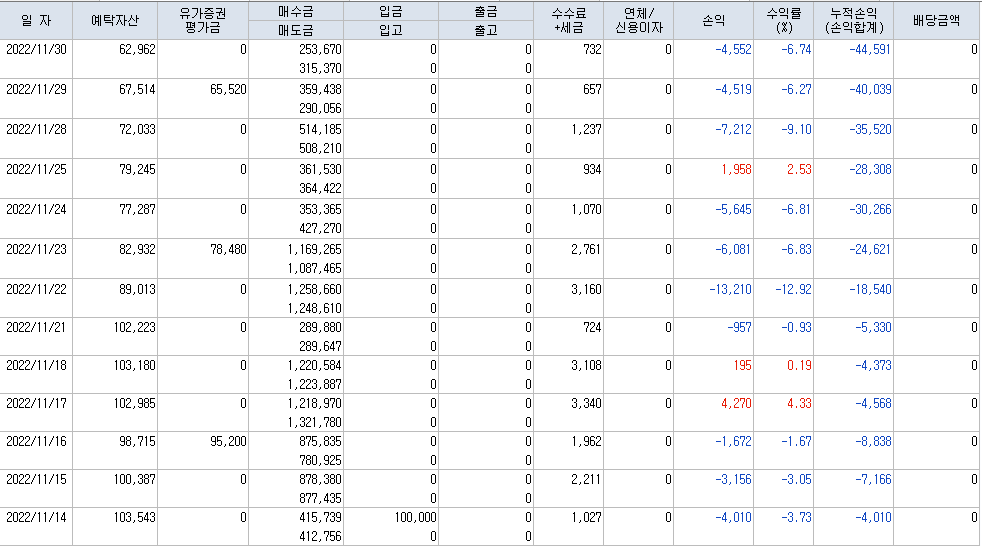 11월 14일에 10만원 세팅하고 매매한 결과 62,962원으로 쪼그라들었다. 13거래일 중 3거래일만 수익내고 모조리 손실이다. 언제쯤 실력이 비약적으로 상승해서 불바다가 될랑가. 계좌만 보면 한숨밖에 안나오네. 11월 한달 약 -40% 손실로 마감했다. 과연 12월은 어떻게 될런지.