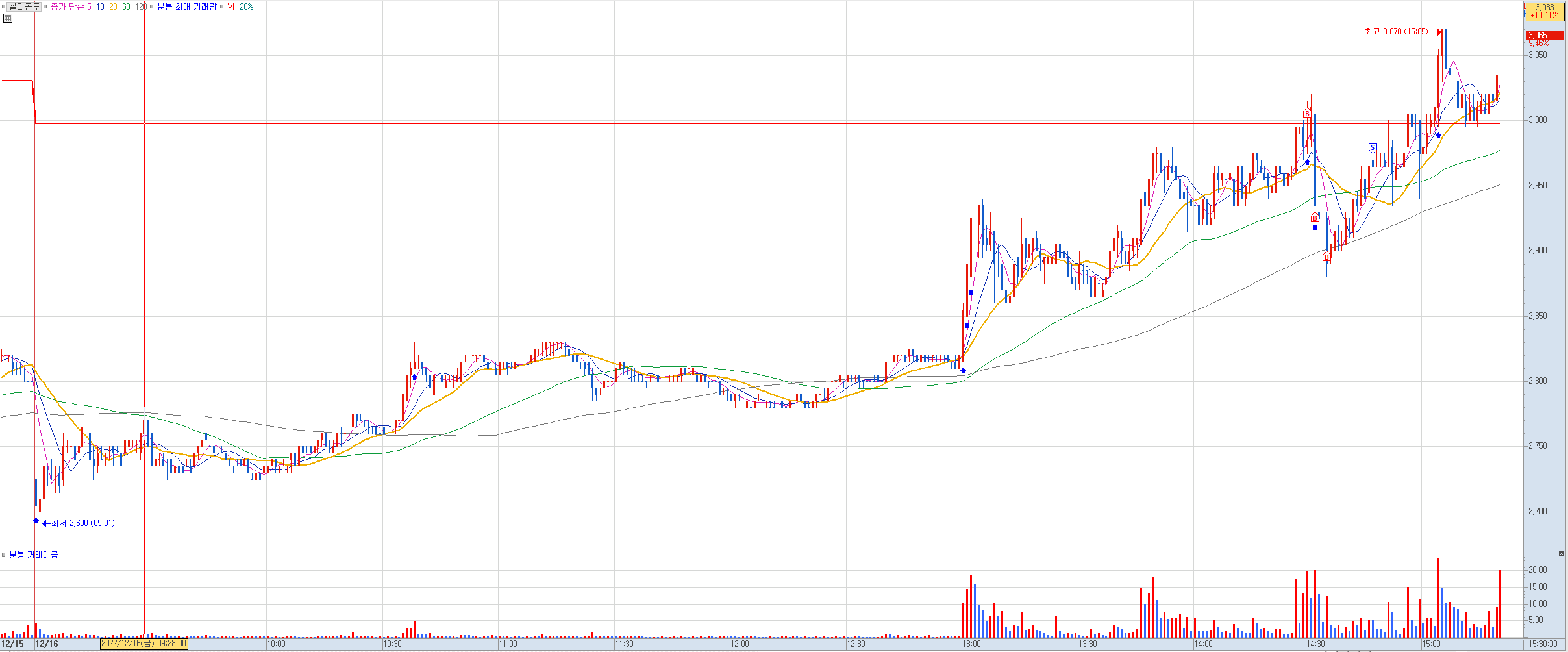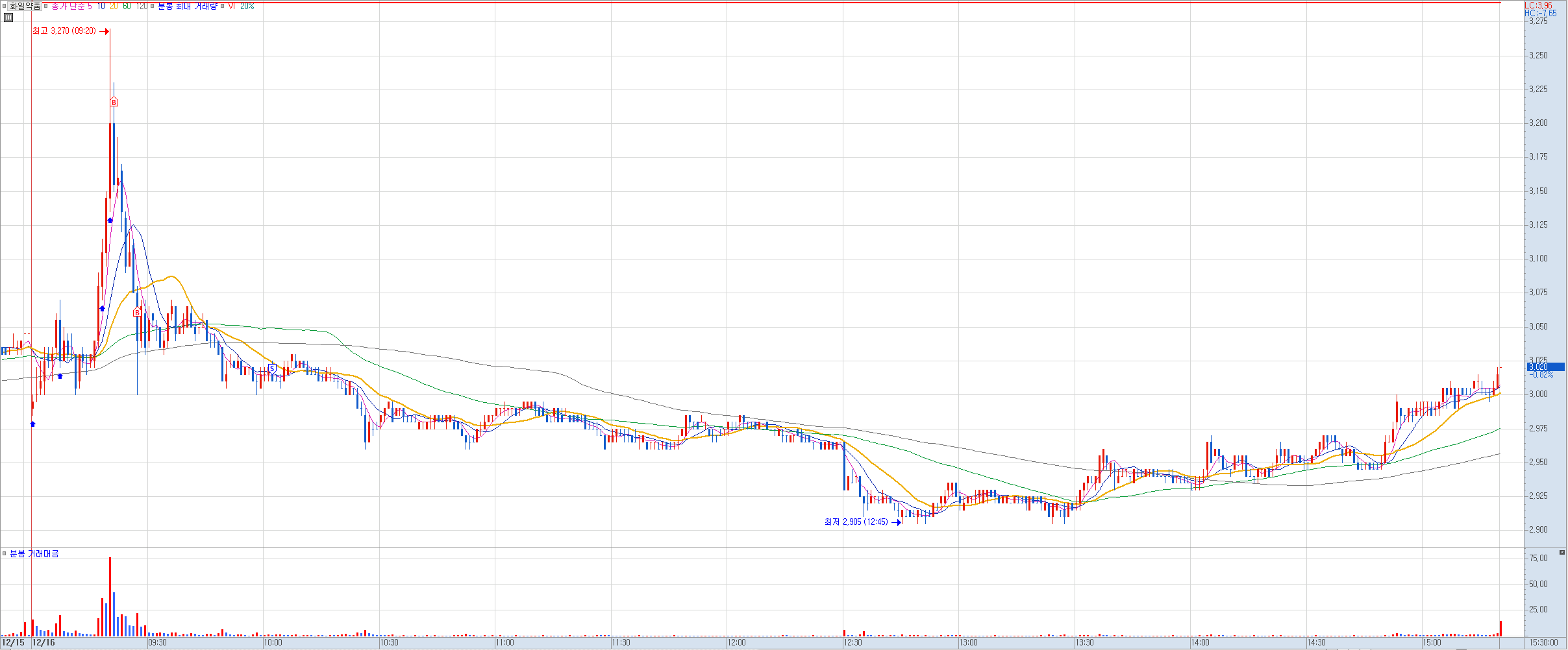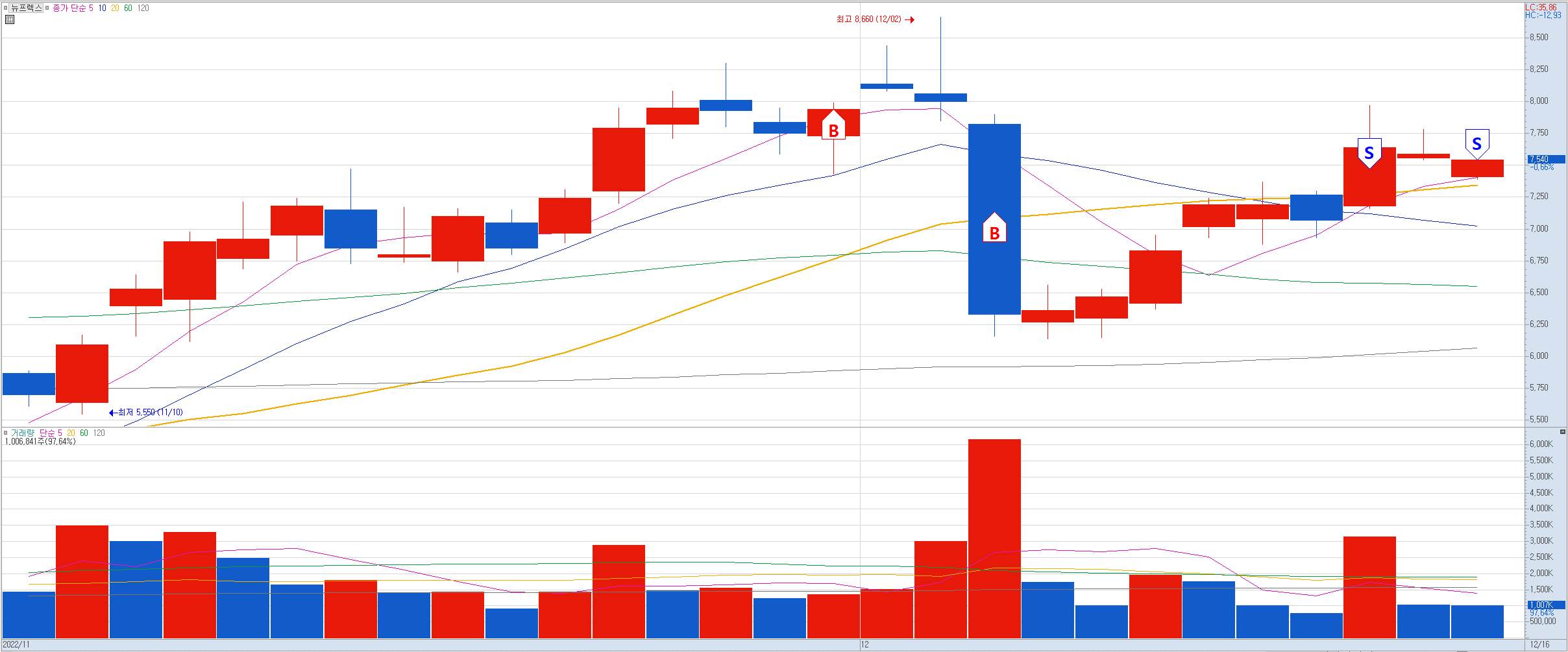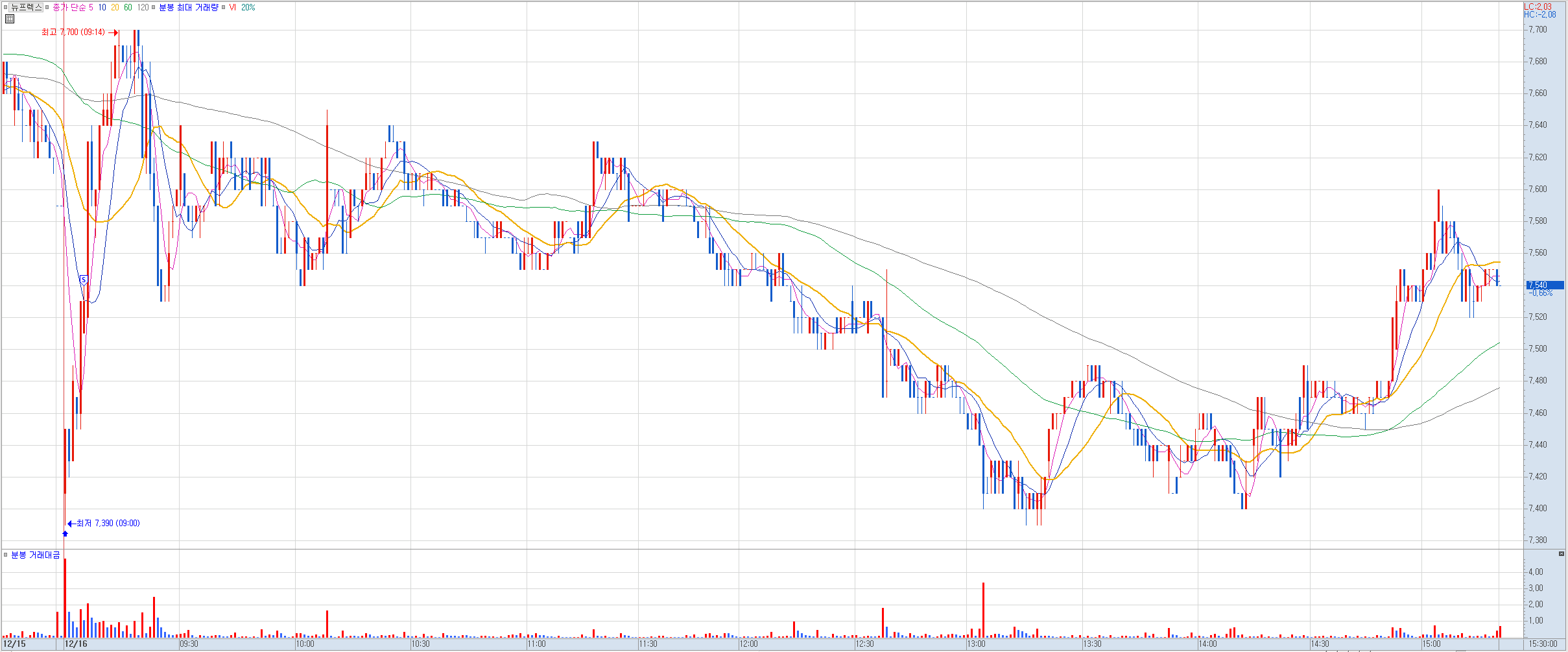 비고: 어제 미증시 급락으로 오늘 우리 증시도 급락할 것을 우려해 어제까지 수익권에 있던 이 종목을 정리하기로 했다. 장초반 갭하락하며 마이너스 수익으로 출발했으나 이후 계속 상승하는 모습에 어제 저점인 7,540원에 전량 정리. 소액 익절로 마무리했다. 하지만 이후에도 거침없이 더 올라 7,700원까지 찍어줬다. 미증시 때문에 잔뜩 쫄아 있었는데 오늘 우리 지수도 그렇고 큰 하락은 없었다. 한때 8%때 수익까지 갔었던 걸 3호가 차이로 정리에 실패했는데. 운도 지지리 따라주질 않네.