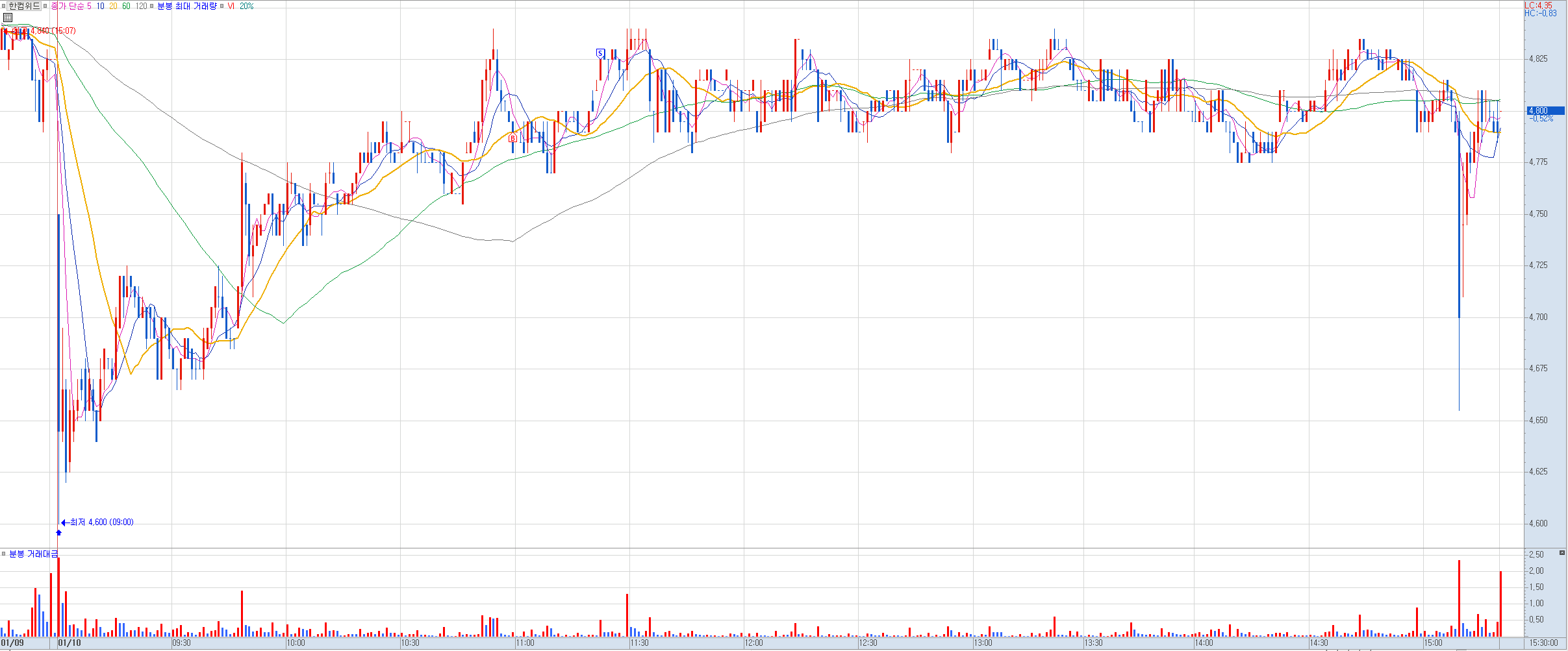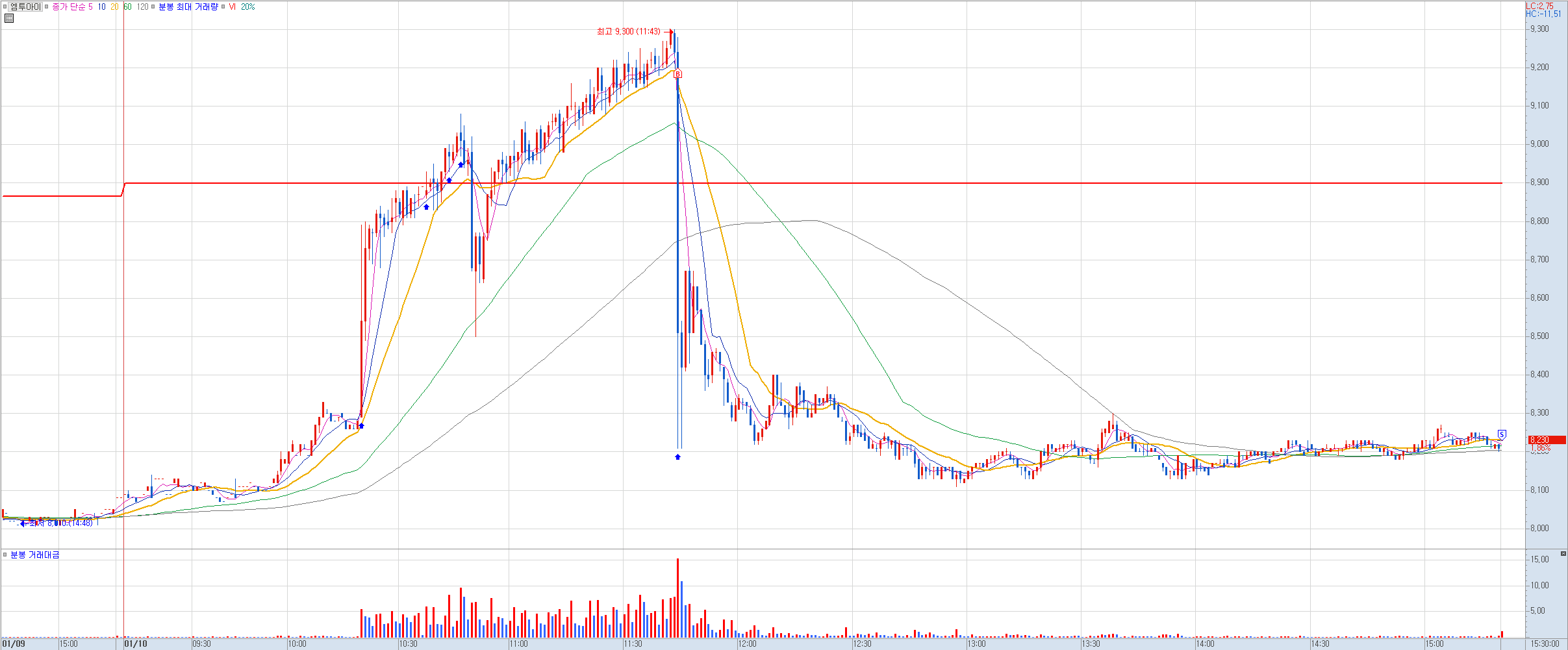 비고: 20분선을 이탈하지 않고 계속 상승하는 모습에 20분선 터치되는 지점에 미리 걸어놓고 있었으나 바로 엄청난 장대 음봉을 그리며 엄청난 짱돌을 쳐맞고 말았다. 혹시나 다시 급반등이 나올까 싶어 기다려봤으나 결국 거의 바닥권에서 매도. 아~ 정말 죽어라 안된다. 내내 잘오르다가 진입해야지 마음먹고 들어가면 기다렸다는 듯이 짱돌을 던져버리네 썅!