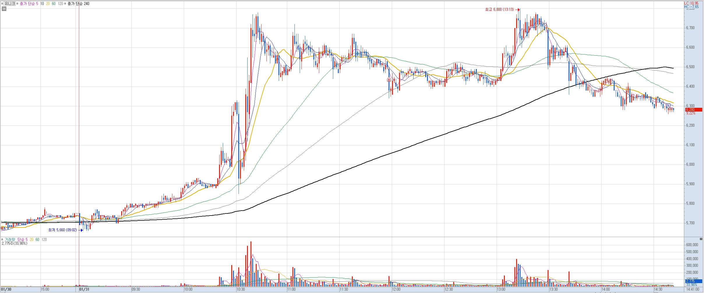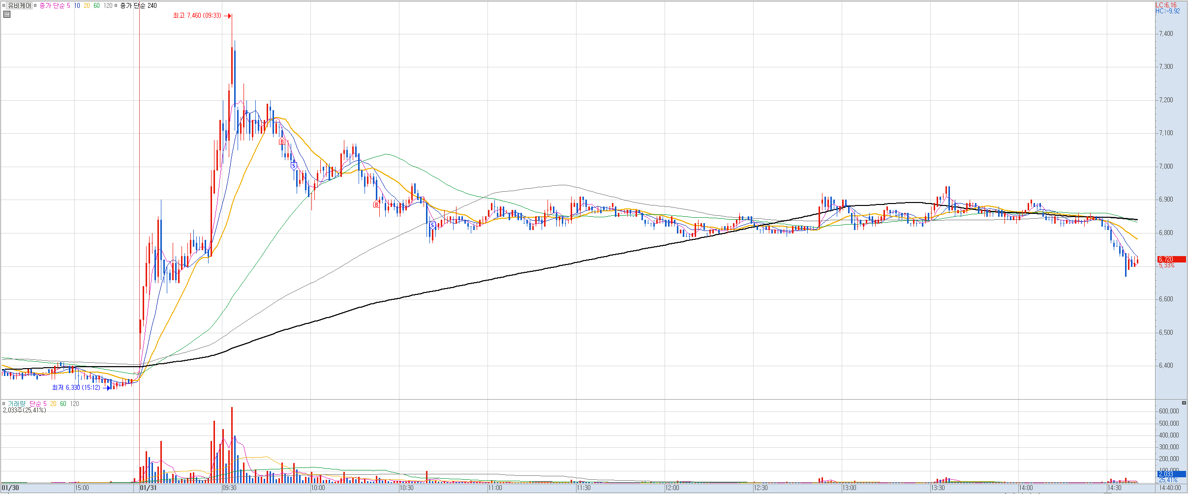 비고: 6,900원에 미리 매도를 걸어놨었으나 거기까지는 상승하지 못함. 그냥 당일 손절분 정리되는 정도로 마무리했어야 했는데 또 욕심 부리다 오히려 손절했고 손실폭도 더 키웠다.