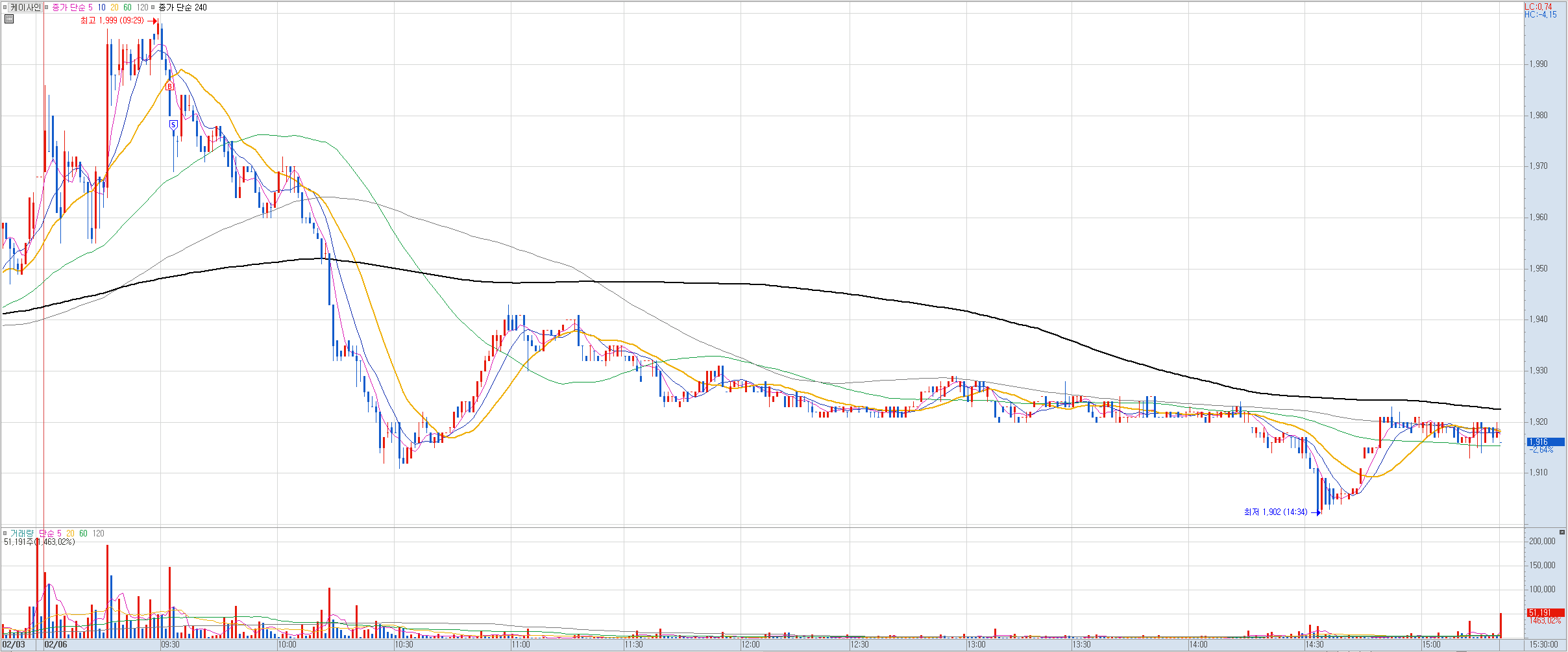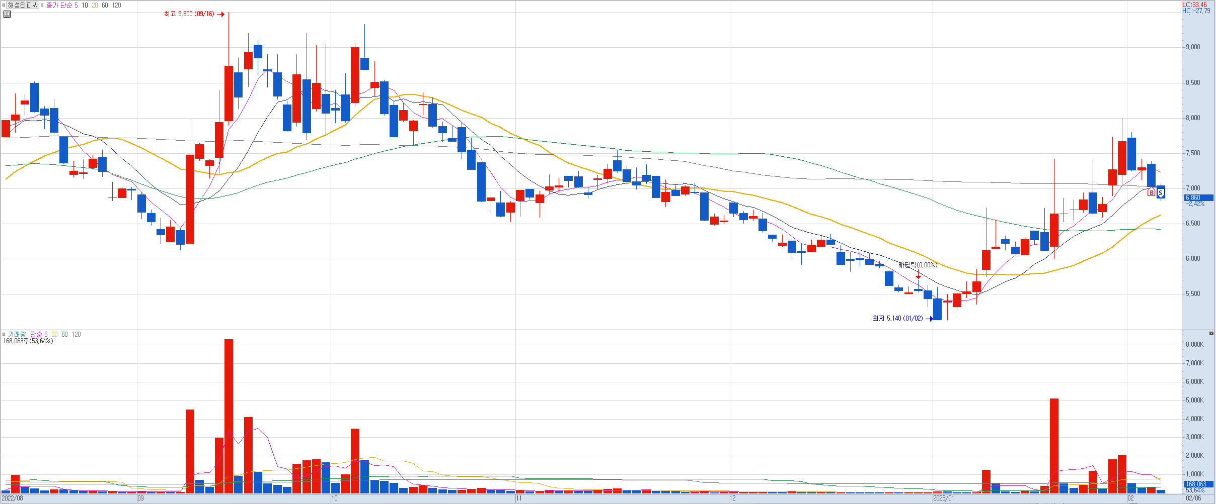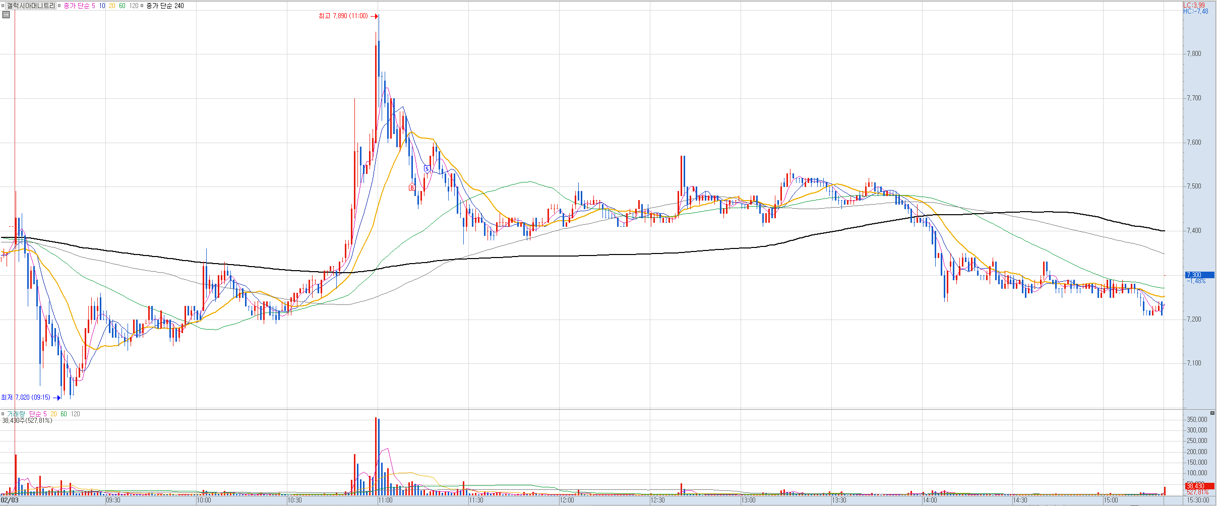 비고: 로봇 관련주로 엮인 종목으로 지난 주 금요일 240일선에서 저항받으며 10일선, 120일선이 만나는 지점에서 브레이크 걸리는 모습에 진입. 최근 로봇 관련주가 잘 갔었으므로 다시 반등을 기대하고 시간외에서 당일 종가인 7,030원에 진입. 만일 오늘 하락 마감시 바로 손절할 계획이었다. 사실 손실이 예상보다는 더 컸다. 암튼 오늘의 하락으로 20일선까지 봐야할 상황이라 판단해 계속 들고 있으면서 손해를 키울 필요는 없다고 판단하여 그냥 손절처리 했고 20일선과 직전 저점이 만나는 지점까지 기다려볼 예정이다.