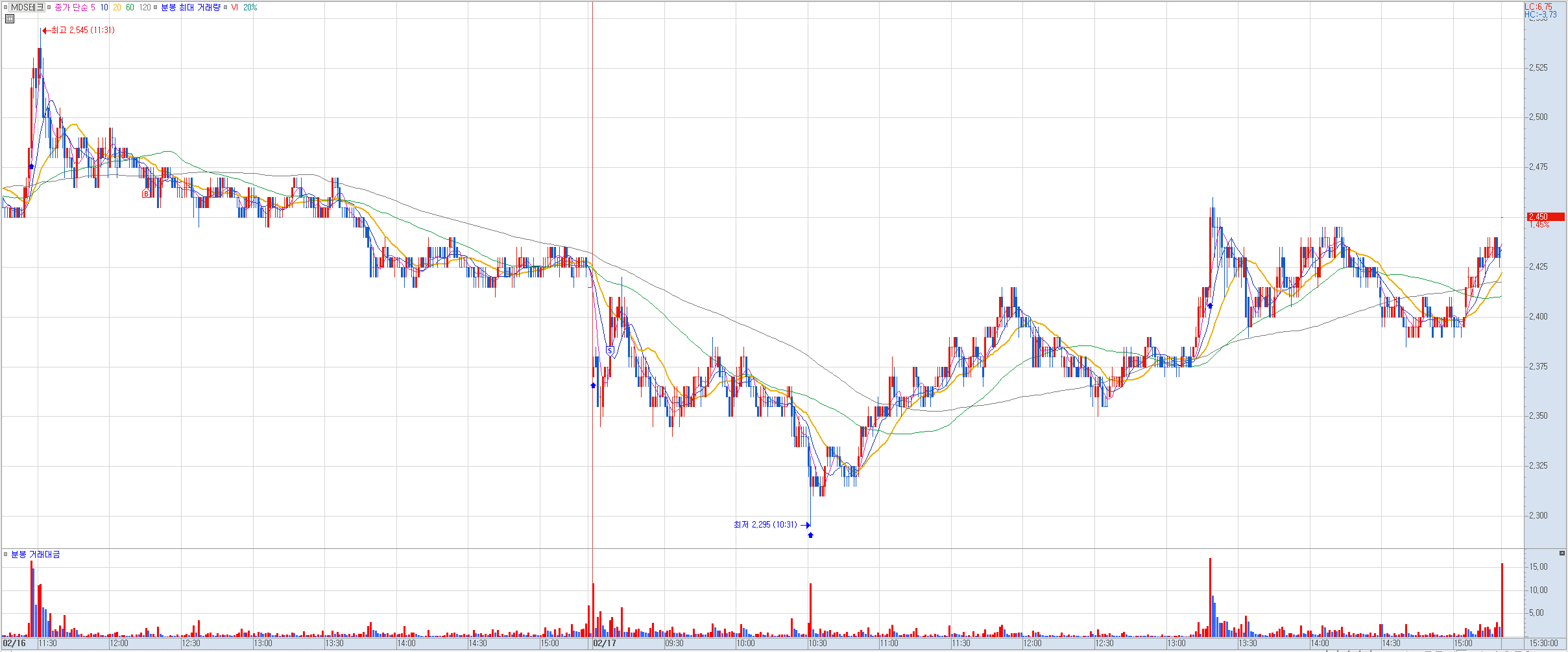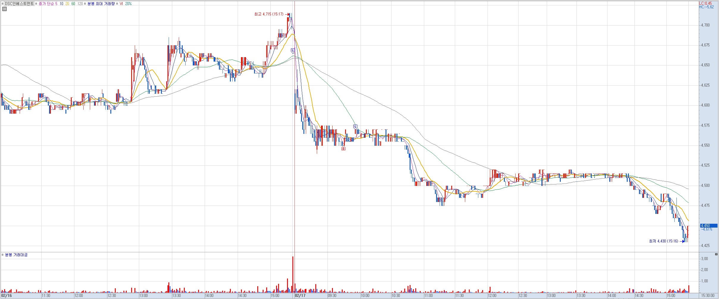 비고: 장초반 지지라인을 형성하는 모습에 지지라인인 4550원에 진입, 계속 저항받았던 4570원에서 매도. 시간이 갈수록 예상보다 더 빠지는 모습에 240일선도 이탈했고, 역시 금요일 장은 하지 않는게 좋겠다라는 생각을 다시 한번 하게 됨.