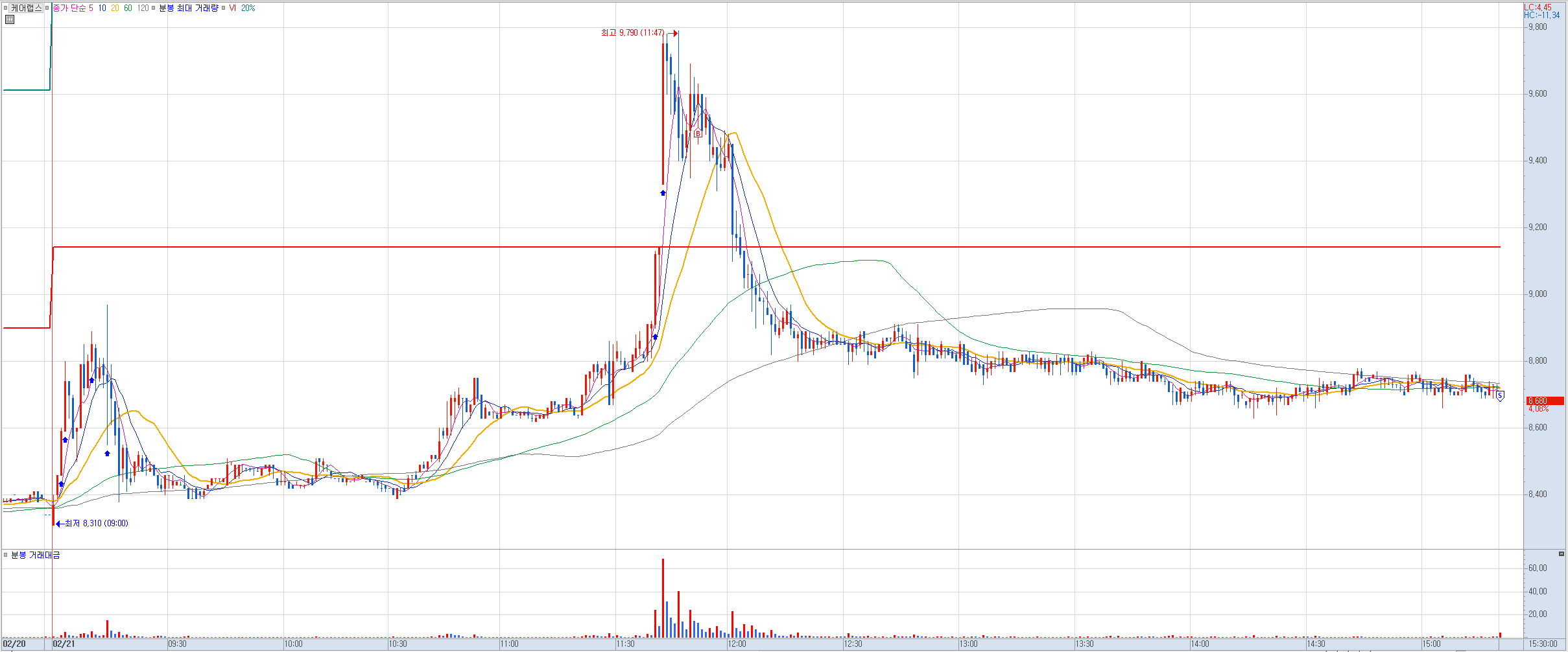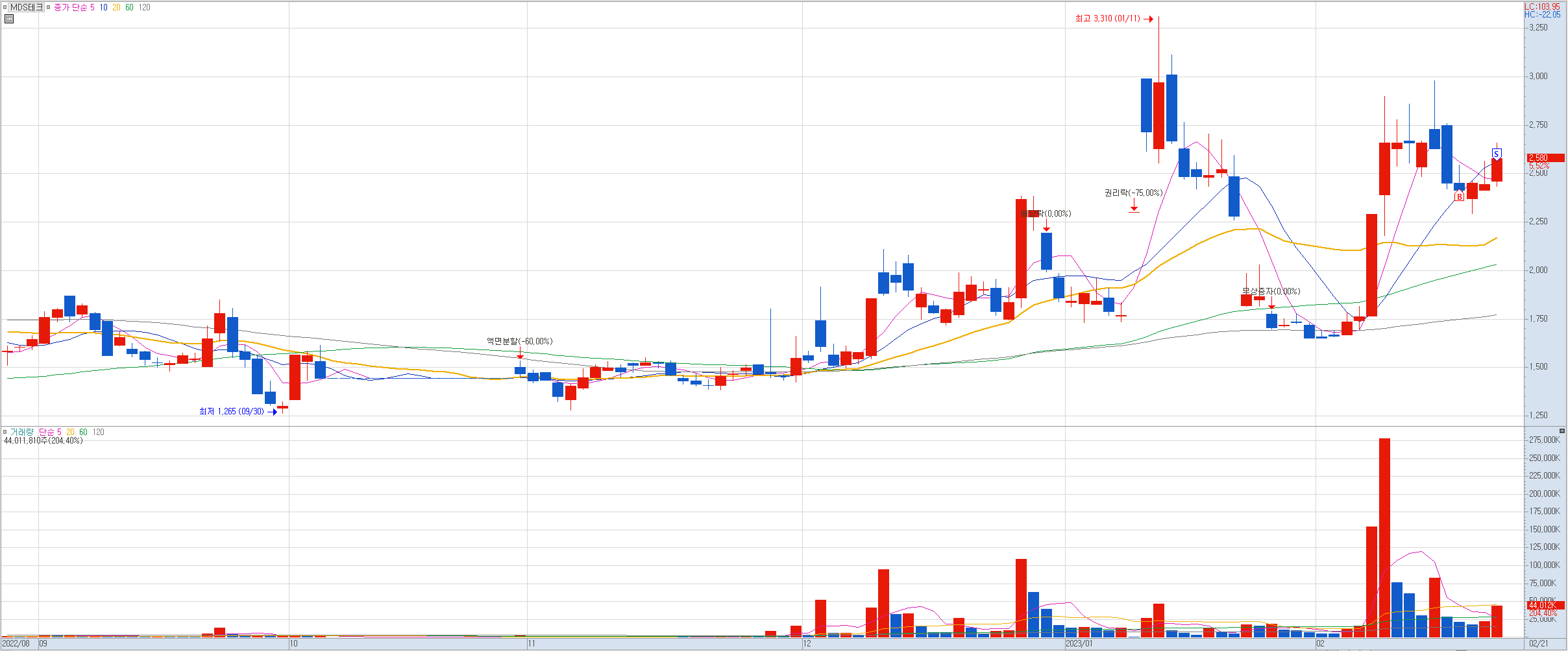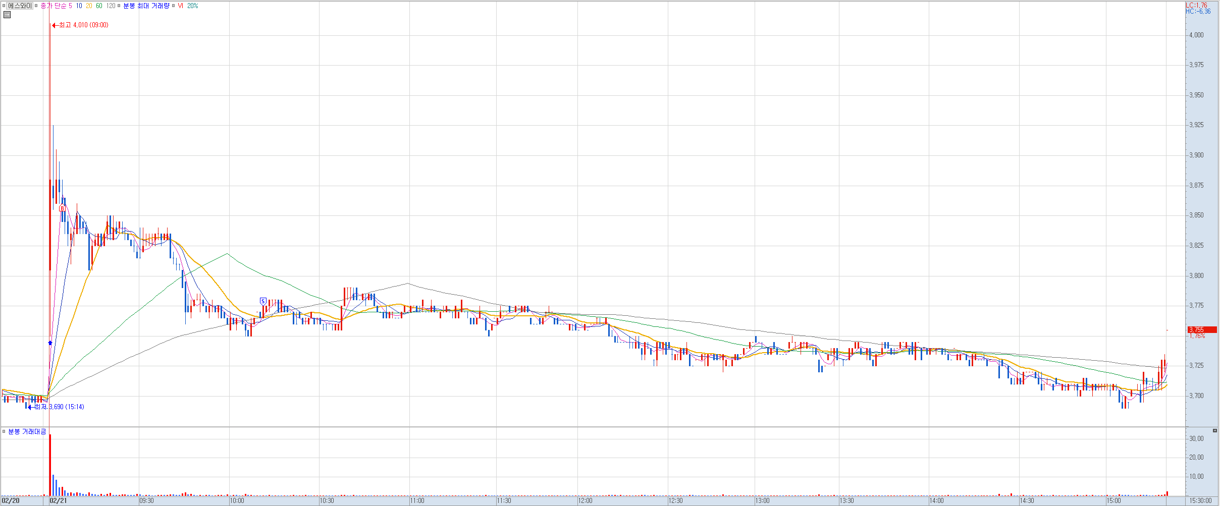 비고: 최근 상한가 이후 장대 음봉의 저점 라인에서 진입 후 털릴 뻔하다가 다시 반등하는 모습에 오늘 전일 고점에서 절반 익절. 몸통 기준 직전 고점인 2750원 또는 꼬리 고점인 3000원에서 나머지 물량을 정리할 예정. 만일 매수가 이탈할 것 같은 모습을 보이면 본절 정리할 예정