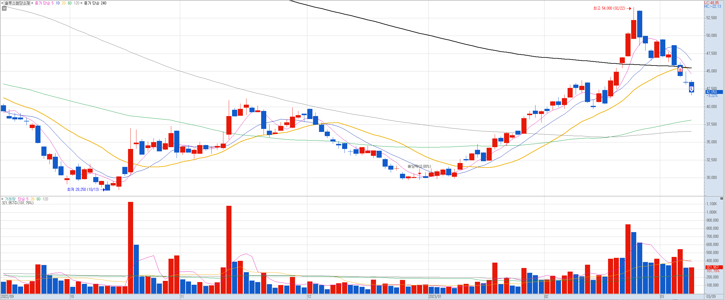 내용: 240일선을 돌파한 후 조정받는 모습에 240일선 터치 지점에 진입. 진입 후 미리 정해놨던 손절가인 45,000원 돌파하며 마감할 때 그냥 팔았어야 했는데 팔지 못했다. 이렇게 240일선을 페이크로 한번 이탈시켰다가 다시 재돌파하는 경우가 많으므로. 하지만 그냥 계속 하방했고, 오늘은 엎친데 덮친 격으로 테슬라 결함 이슈로 미국 도로교통안전국에서 조사한다는 악재로 급락하며 손실을 더 키웠다.