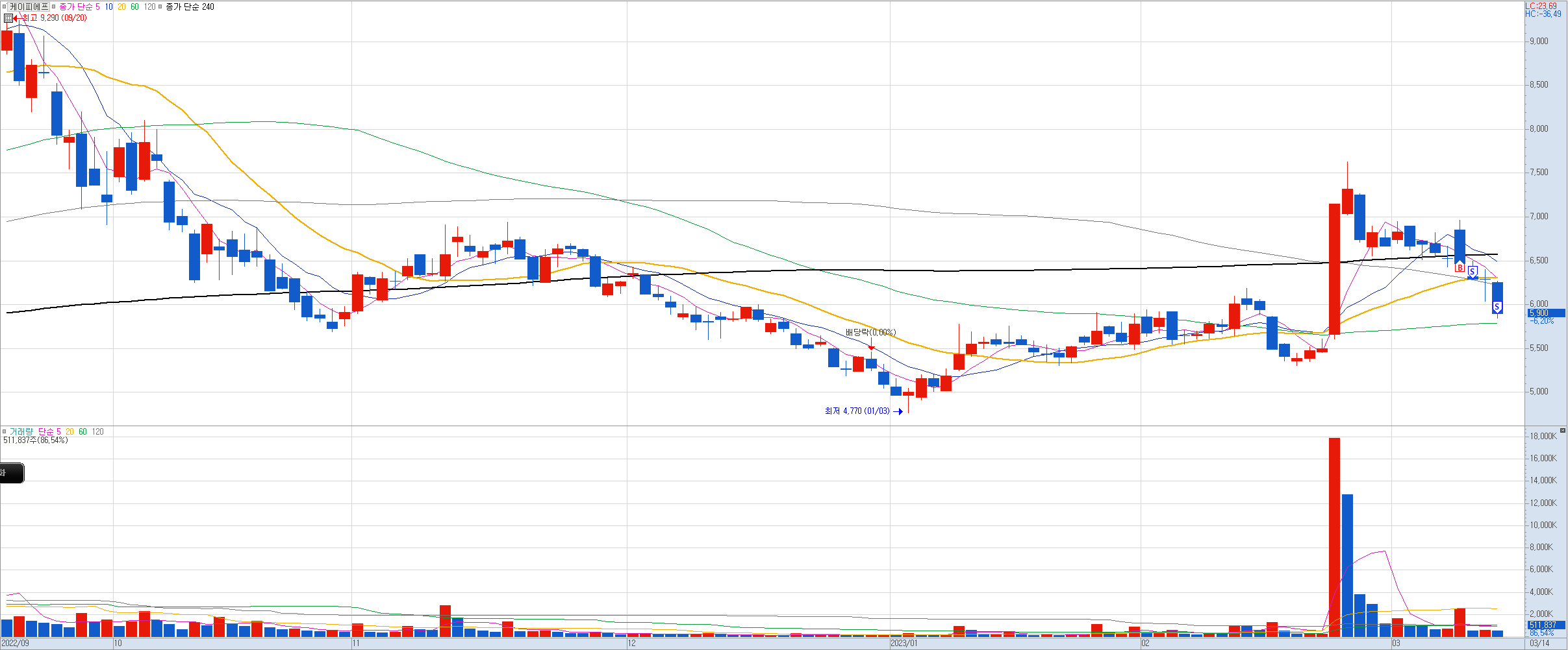 내용: 앞서 절반 물량 덜어낸 후 어제 장막판에 손절 기준인 6,300원 위에서 움직이는 모습에 더 버티려고 계획했으나 종가가 6,300원을 이탈하며 마감했다. 페이크에 당했다. 그리고 나서 오늘 늦잠을 자는 바람에 뒤늦게 HTS를 확인해보니 이미 어제보다 많이 밀린 상황. 종가까지 확인해보고 20일선을 돌파 못하면 정리하잔 생각이었고 계속해서 밀리는 모습에 종가에 모두 정리했다. 어제 모두 정리했다면 손실은 적었을텐데 페이크에 당하는 바람에 손실이 커졌다.