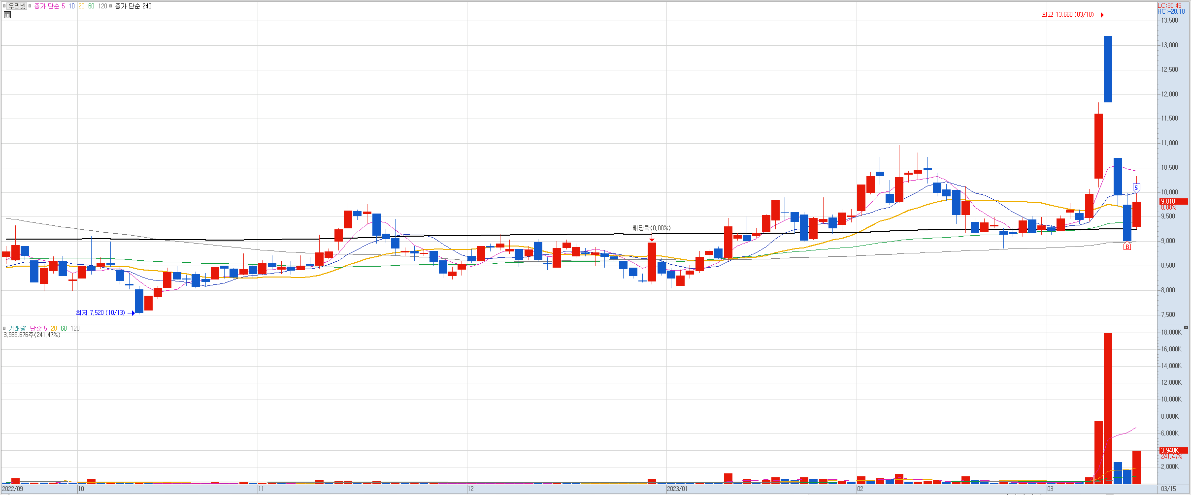 내용: 최근 240일선을 돌파 후 어제 다시 직전 저점 부근까지 하락하는 모습에 종가 진입. 절반 물량을 어제 고점에서 익절. 나머지 절반 물량은 추가 상승시 10,700원에서 할 예정. 하락한다면 240일선 라인에서 정리할 예정.