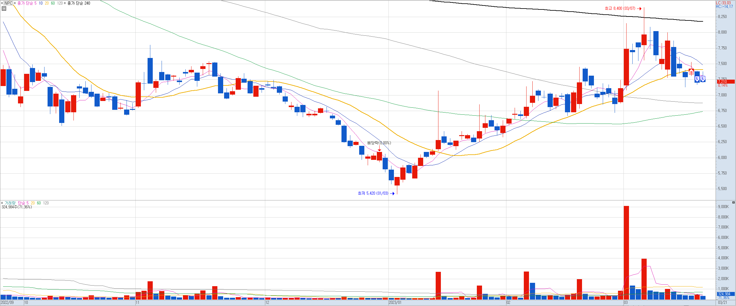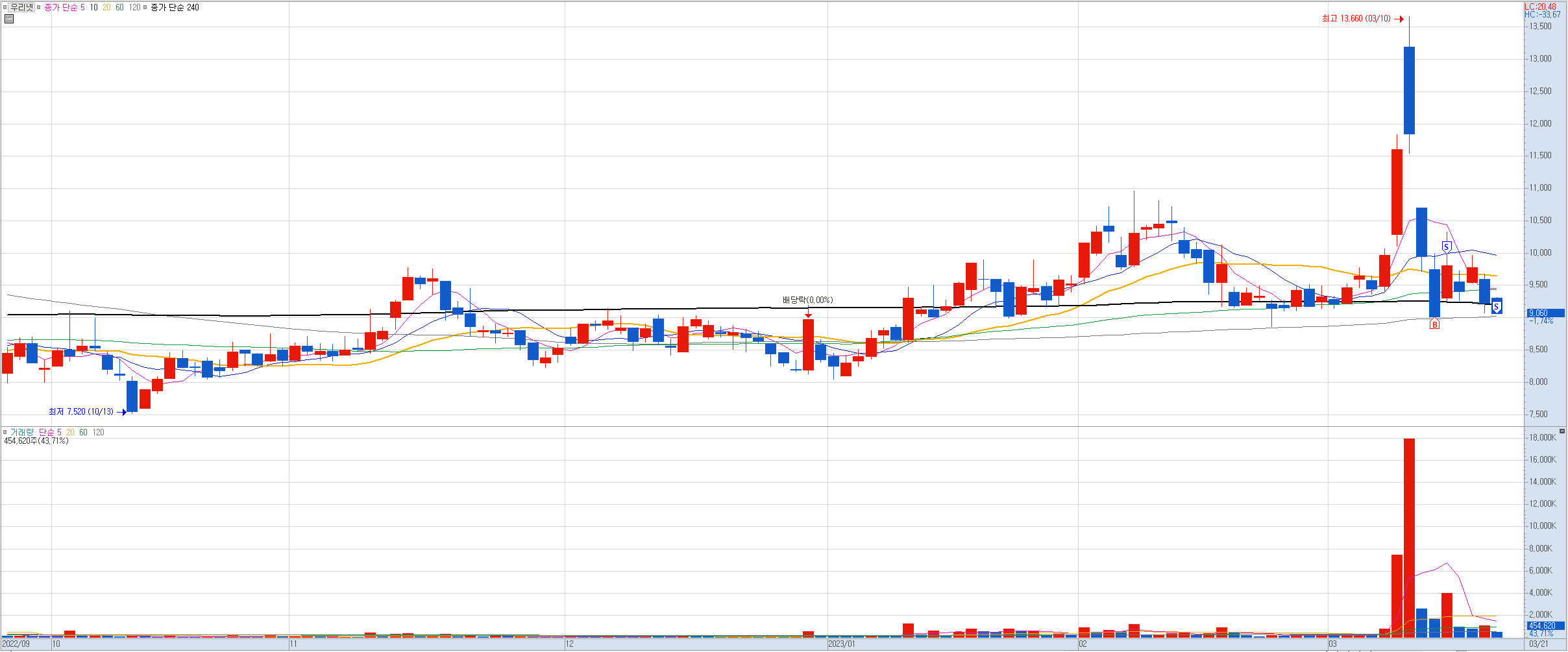 내용: 9,010원에 매수에 9,990원에 절반 물량을 익절 후 추가 상승을 염두에 두고 홀딩중이었고, 240일선을 이탈하지 않고 반등하길 기대했으나 오늘 이탈하는 모습에 나머지 물량 모두 정리했다. 오늘 지수가 나쁘지는 않았지만 보유 종목들은 어째들 하나같이 다 힘이 없는지.