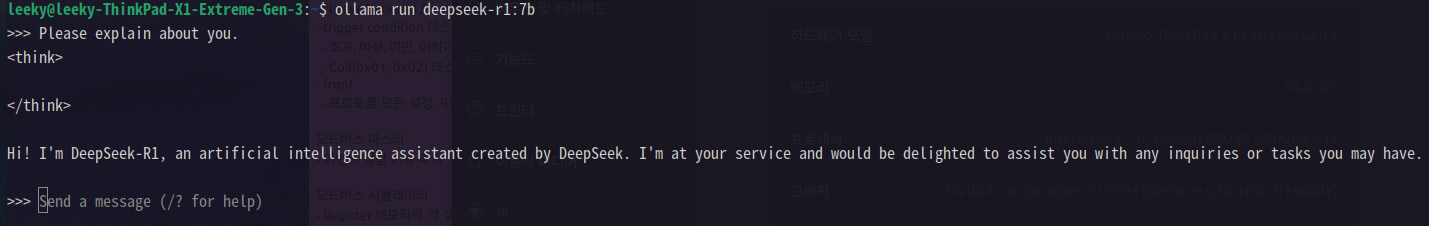 ollama를 통해 간단히 deepseek을 실행해 보면 7b 모델의 경우 신속하게 대답하는 편이다. 단, 한글은 지원되지 않는 것 같다.