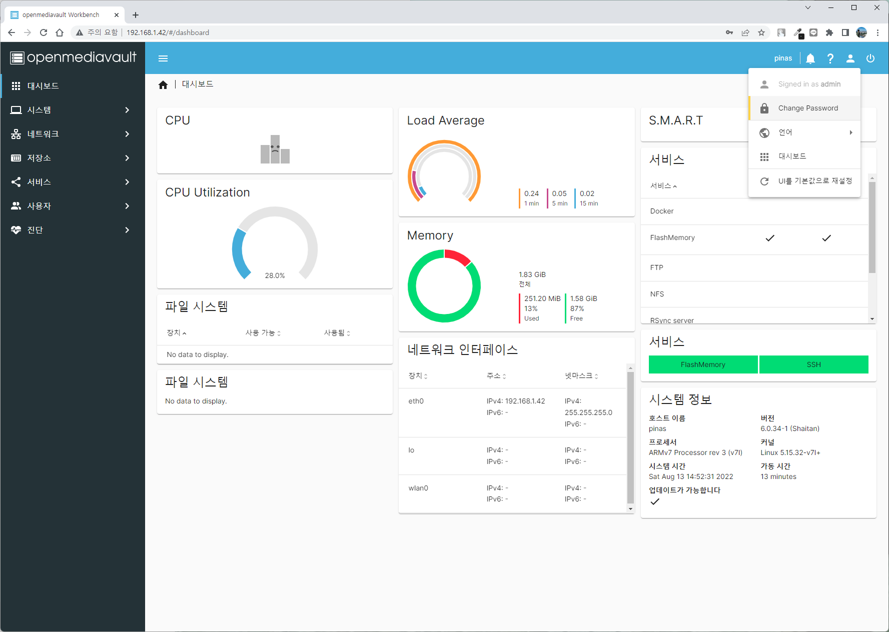8. 참고로 OMV를 설치하고 난 후에는 SSH에 접속이 되지 않는다. 서비스 항목을 보면 SSH가 활성화가 이미 되어 있다고 돼 있는데도 접속이 안되는데 이럴땐 사용자 설정에서 SSH 그룹을 추가해주면 된다.