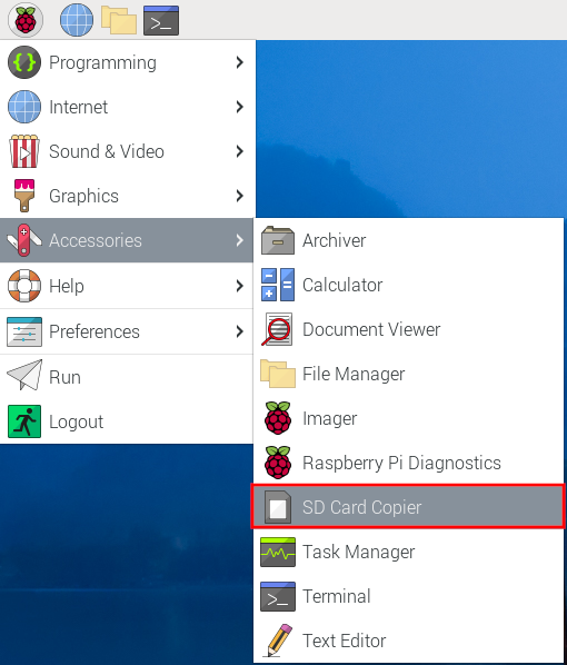 step 9) 시작 버튼 - Accessories - SD Card Copier 클릭