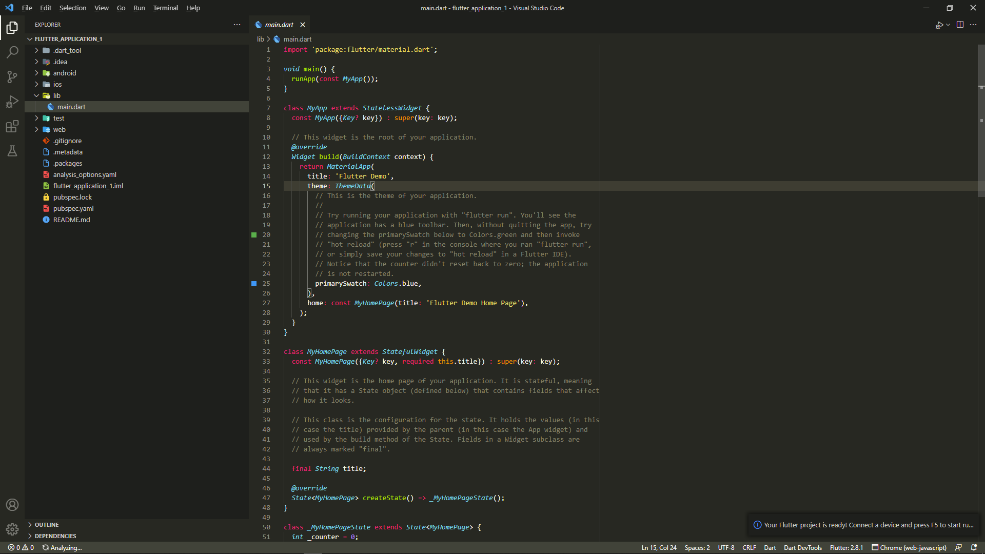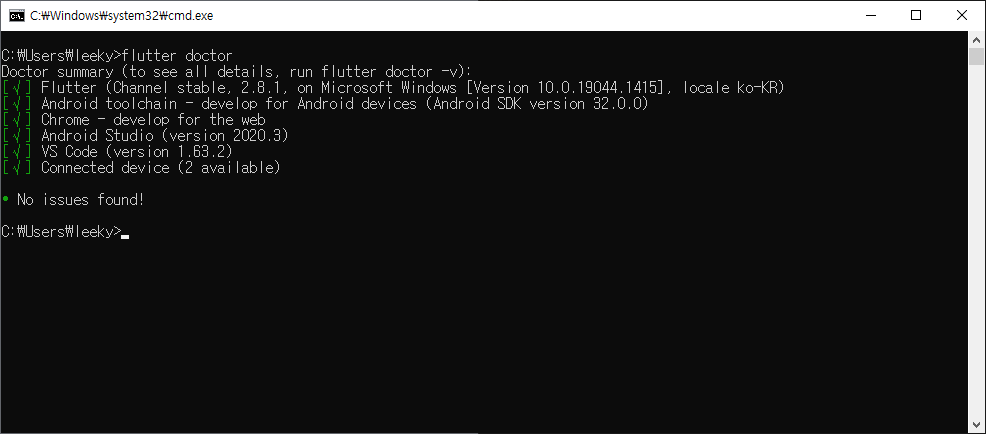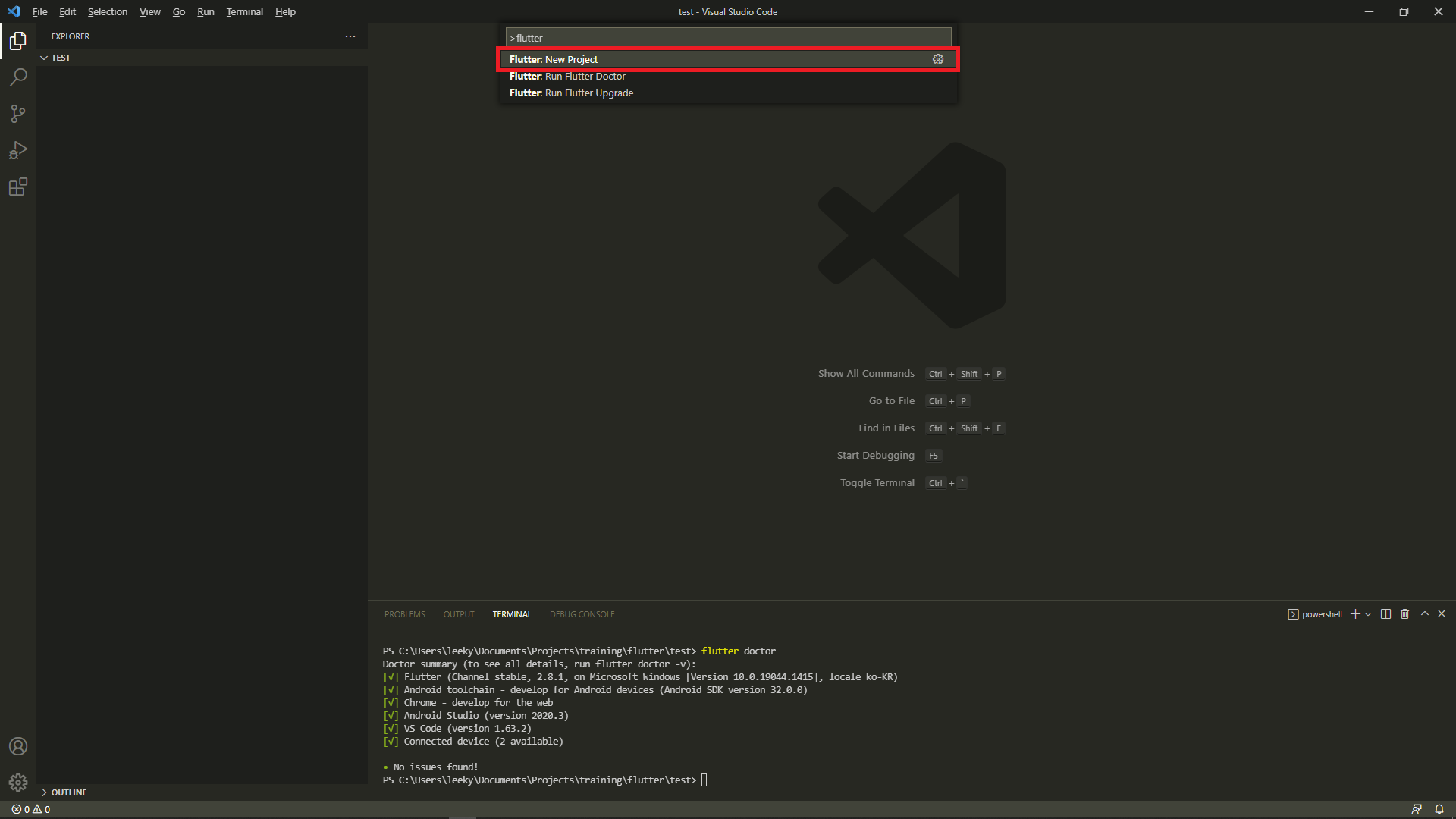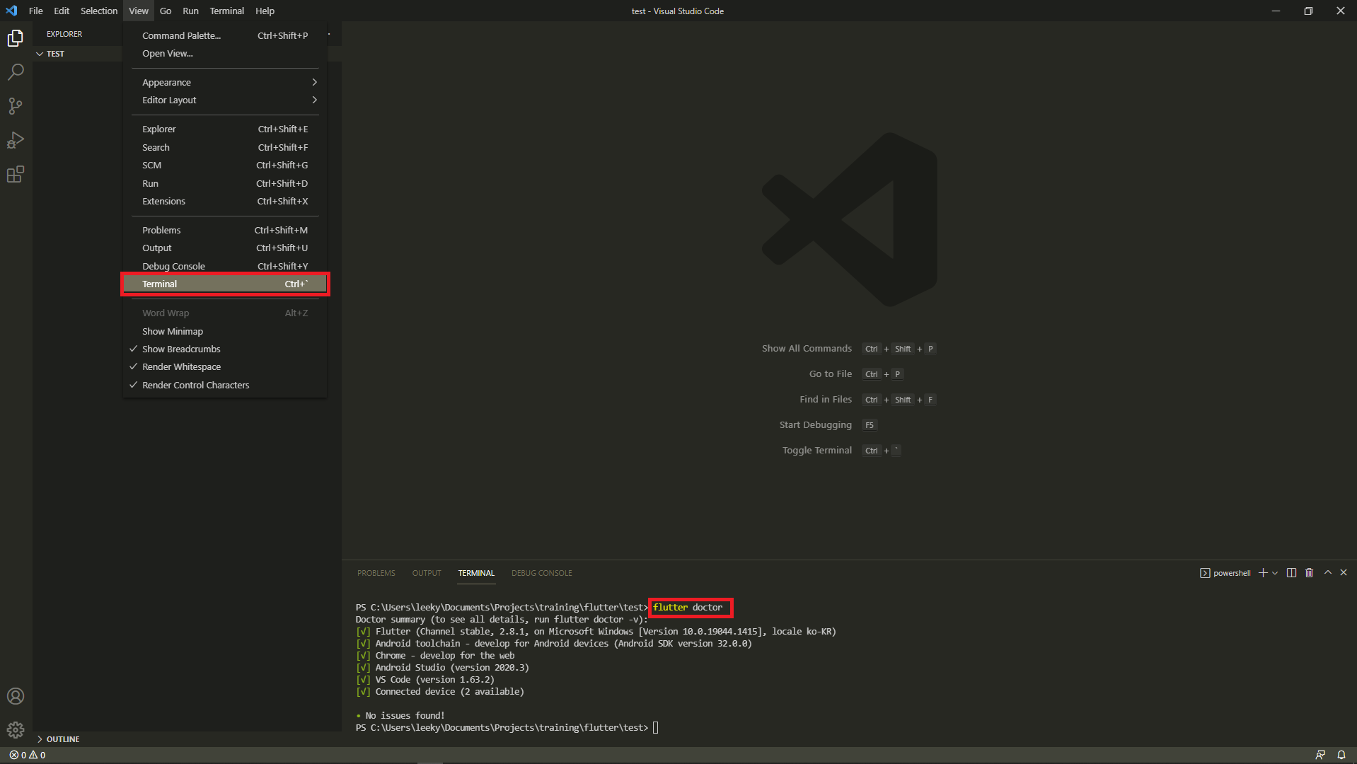 12. View - Terminal을 클릭한 후 'flutter doctor' 명령을 실행하여 다시 한번 문제가 없는지 체크한다.