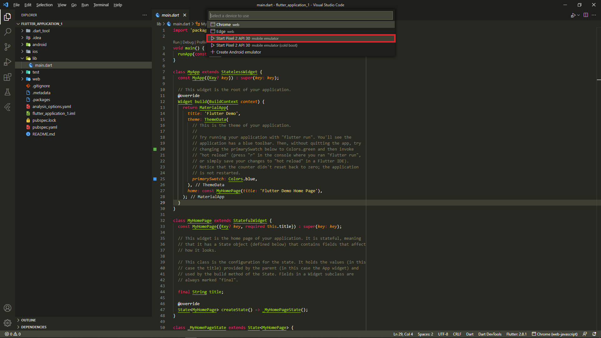 13. View - Command Palette... 클릭 후 'flutter' 입력한 다음 'Flutter: New Project' 클릭