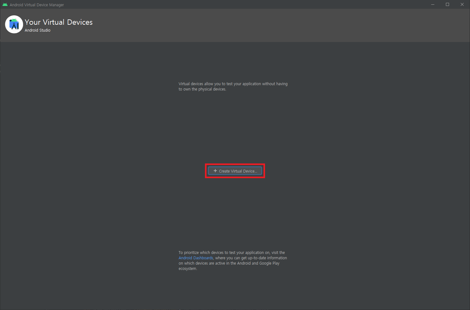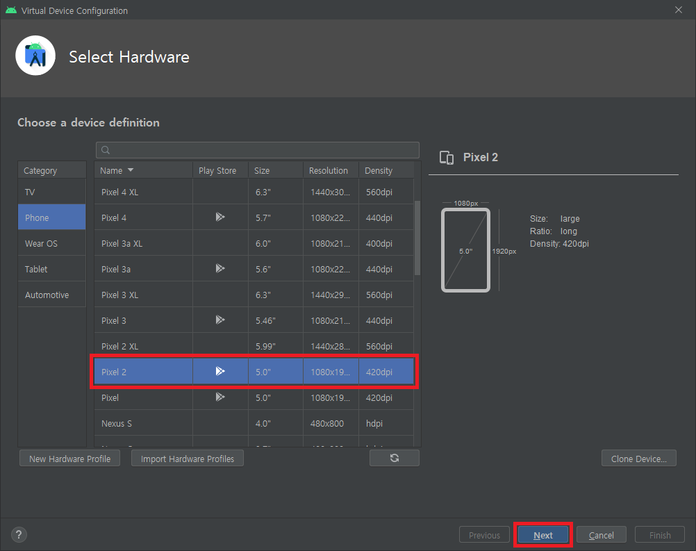 8. 안드로이드 스튜디오 실행 후 AVD Manager 버튼 클릭해서 아래 절차를 통해 가상 디바이스 생성.