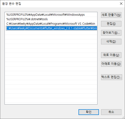 4. 윈도우 콘솔창에서 Flutter 명령어들이 실행되도록 하기 위해 환경변수에 flutter/bin 경로 추가.