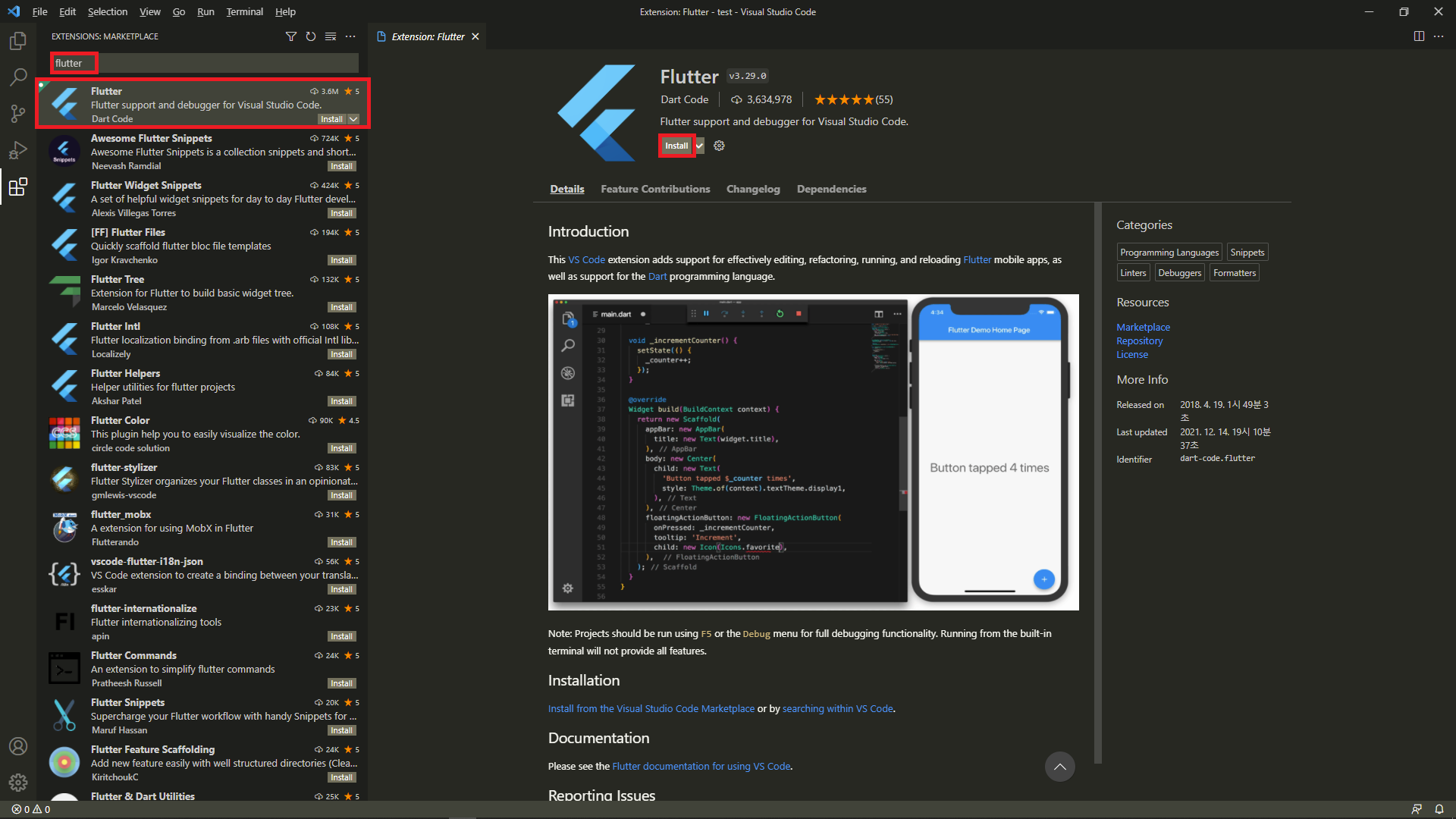 11. 좌상단에 flutter 입력 후 첫번째 Flutter 클릭해서 인스톨.